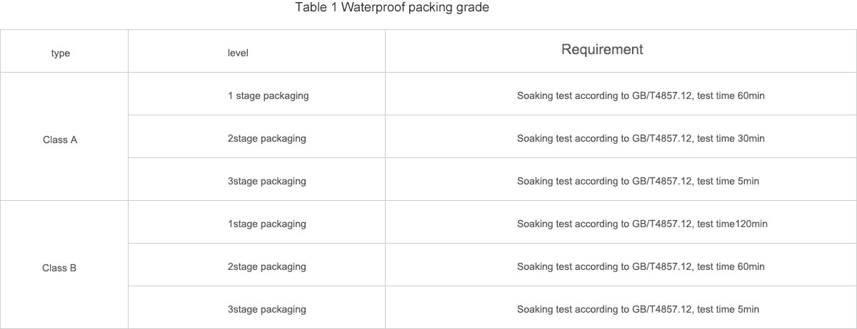 Waterproof packaging grade is divided into class A, grade 1 packaging, 2 grade packaging, 3 grade packaging and B class 1 packaging, 2 grade packaging, 3 grade packaging, see table 1.