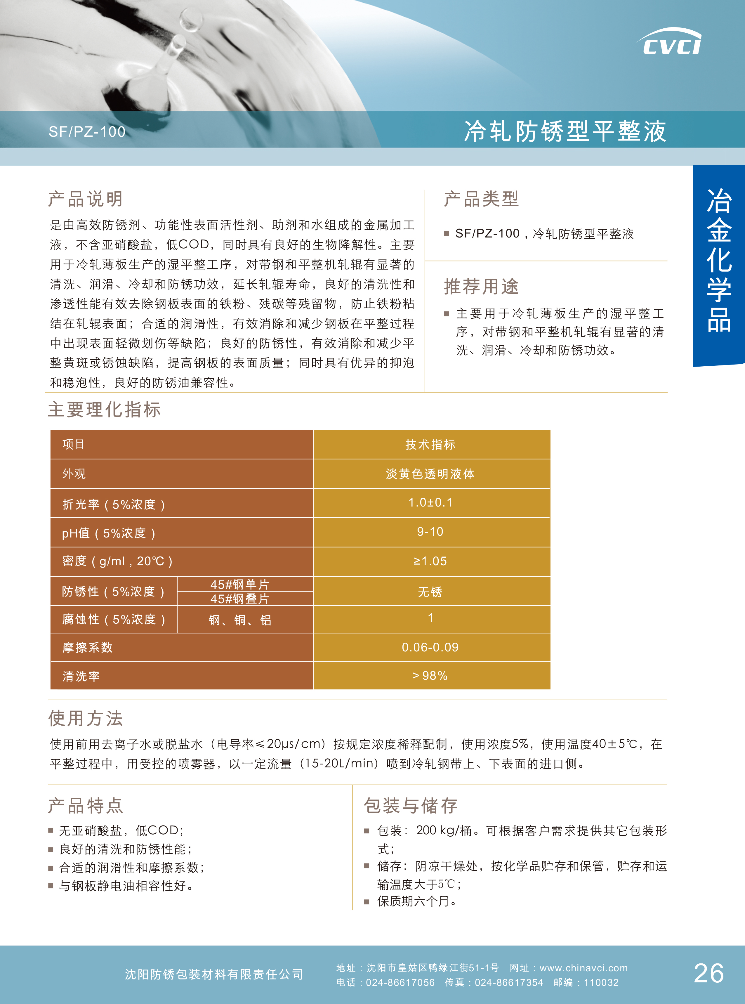 平整液SF/PZ-100,是由高效防銹劑、功能性表面活性劑、助劑和水組成的金屬加工液,不含亞硝酸鹽,低COD,同時具有良好的生物降解性。